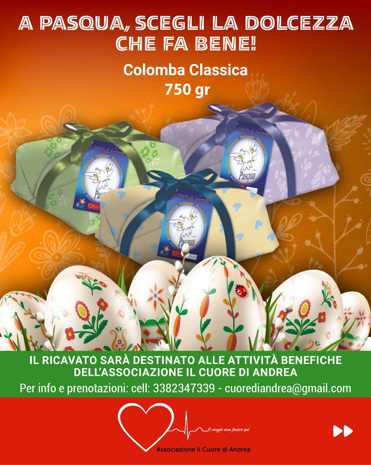 Pasqua è il momento perfetto per fare un regalo che vale doppio. Quest’anno scegli una colomba o un uovo di Pasqua solidale: il ricavato, infatti, sarà destinato alle attività benefiche dell’associazione Il Cuore di Andrea, nata dopo la scomparsa, in giovane età, di Andrea a causa di un’aritmia dall’esito fatale.